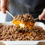 - Top & Bake: Sprinkle the pecan mixture evenly over the sweet potato layer, pressing lightly so it adheres properly. Bake in the preheated 350°F oven for 25–30 minutes, until the topping is golden brown and the casserole is heated through.